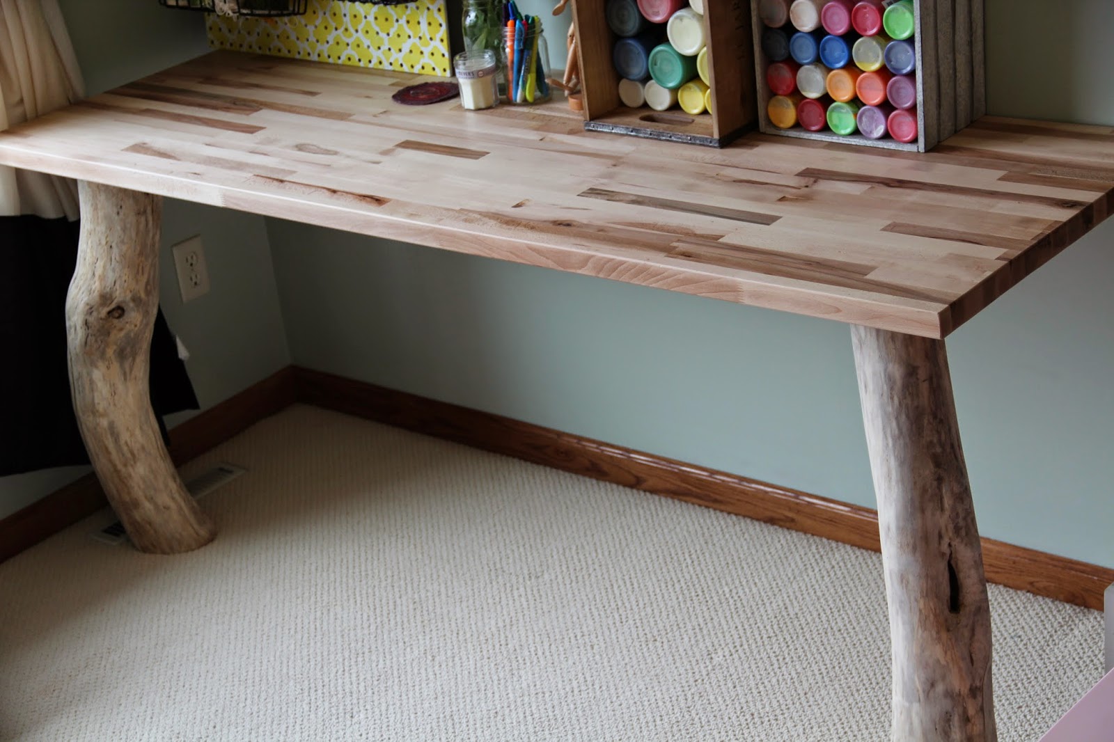 Andy used butcher block for the counter/ the legs are from trees in our back yard! We still have to mount the peg board. ( I WILL POST MORE NEXT WEEK ON THE DETAILS ON EVERYTHING)